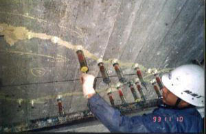 5、安设塑料底座:揭去注入口上的胶带,用封缝胶将底座粘于注入口上;