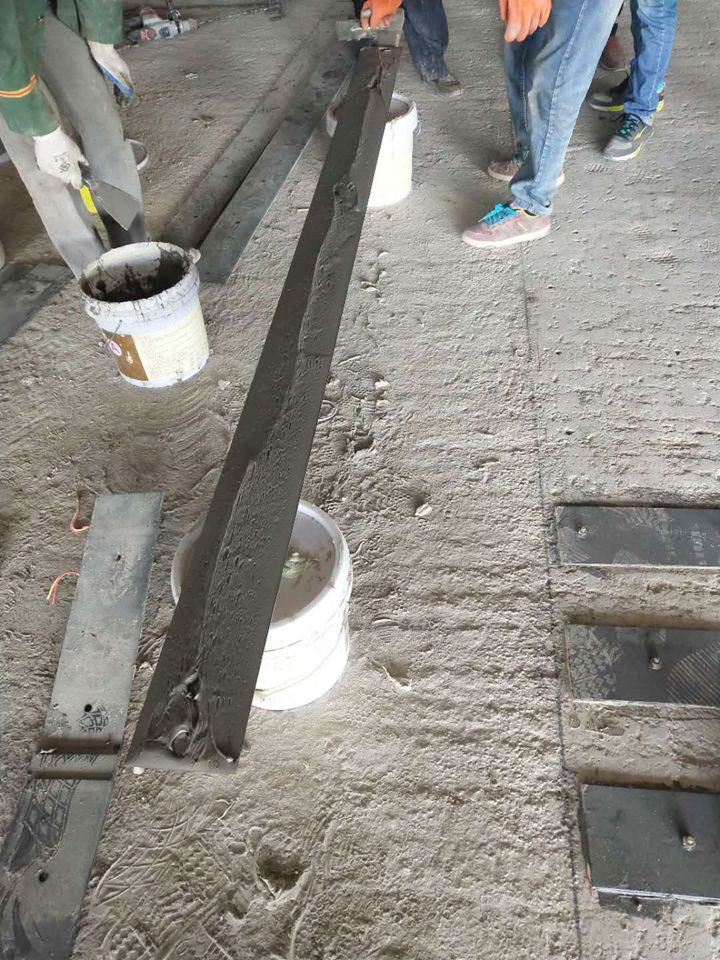 ★打磨后使露出结构本体,并用丙酮擦净,对钢板的粘结面进行夹带、除锈处理;粘结面打磨后应显露金属光泽,并用丙酮擦净。